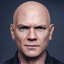 Полноватый крупный мужчина. Лысая голова. Есть татуировки.